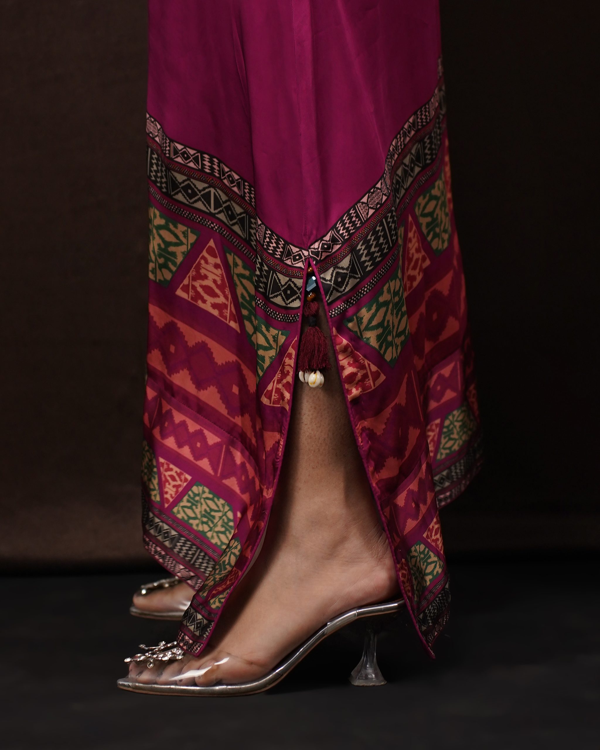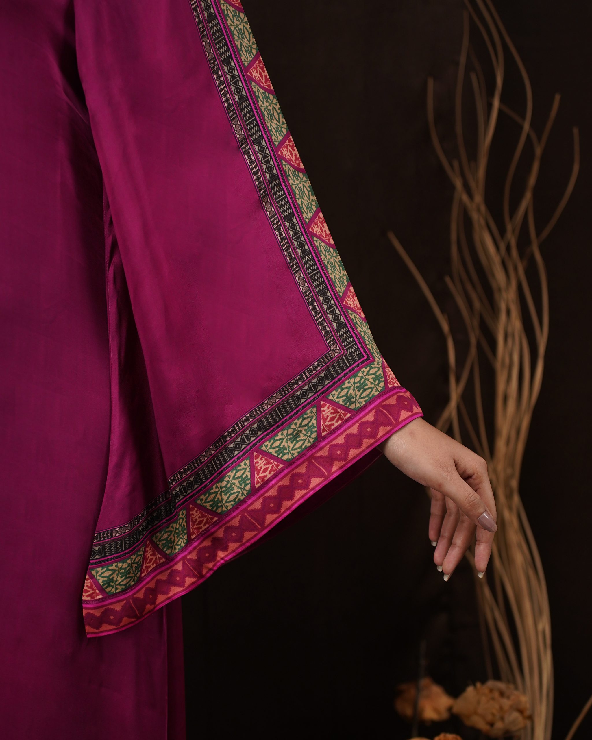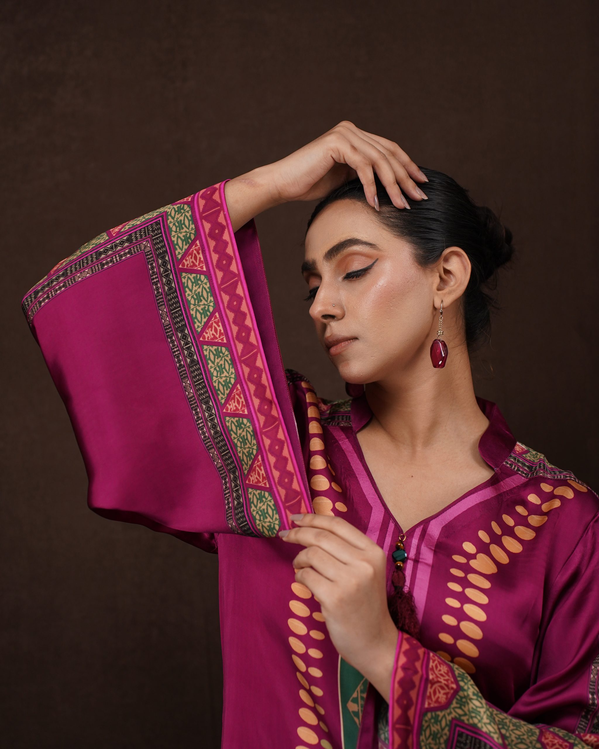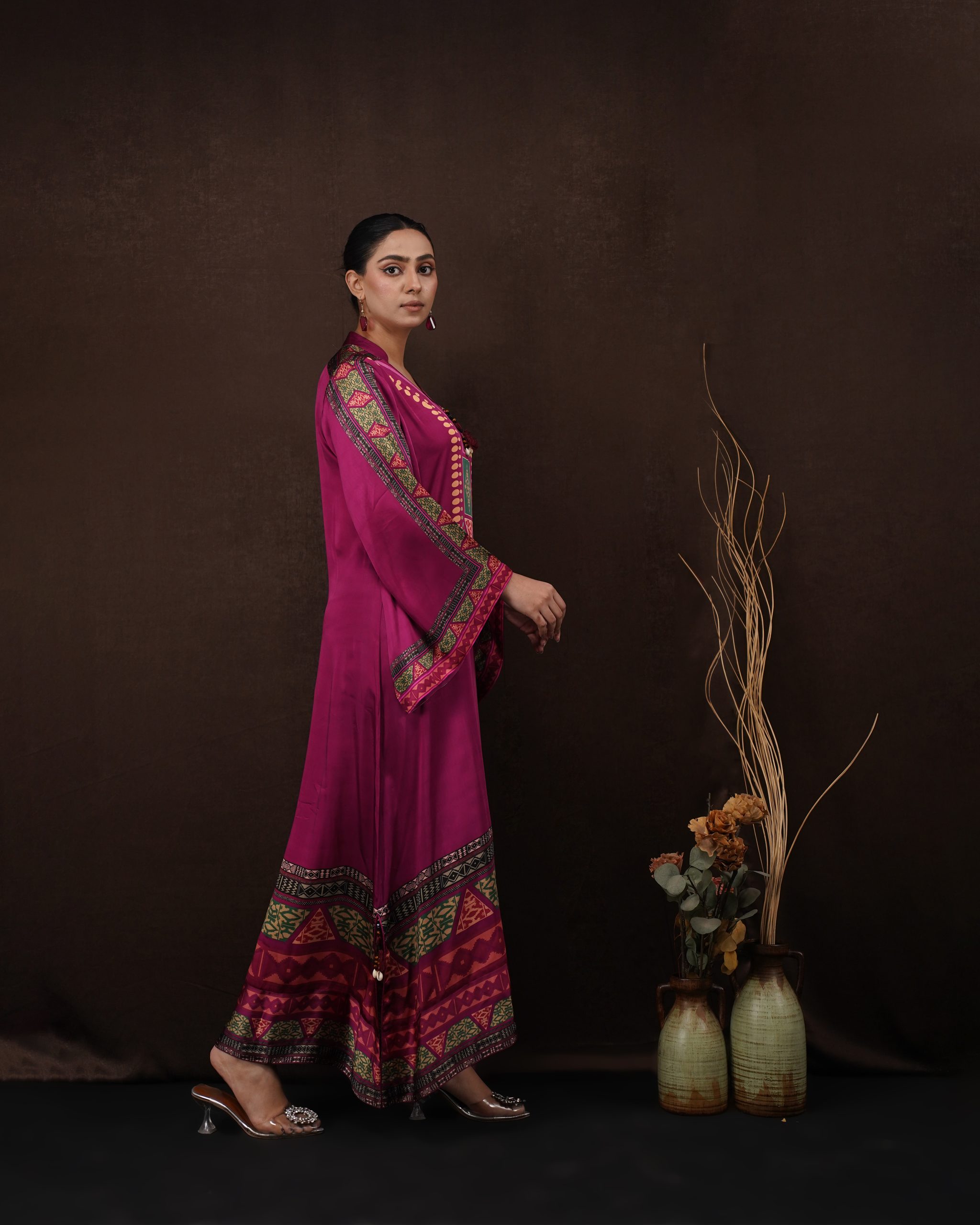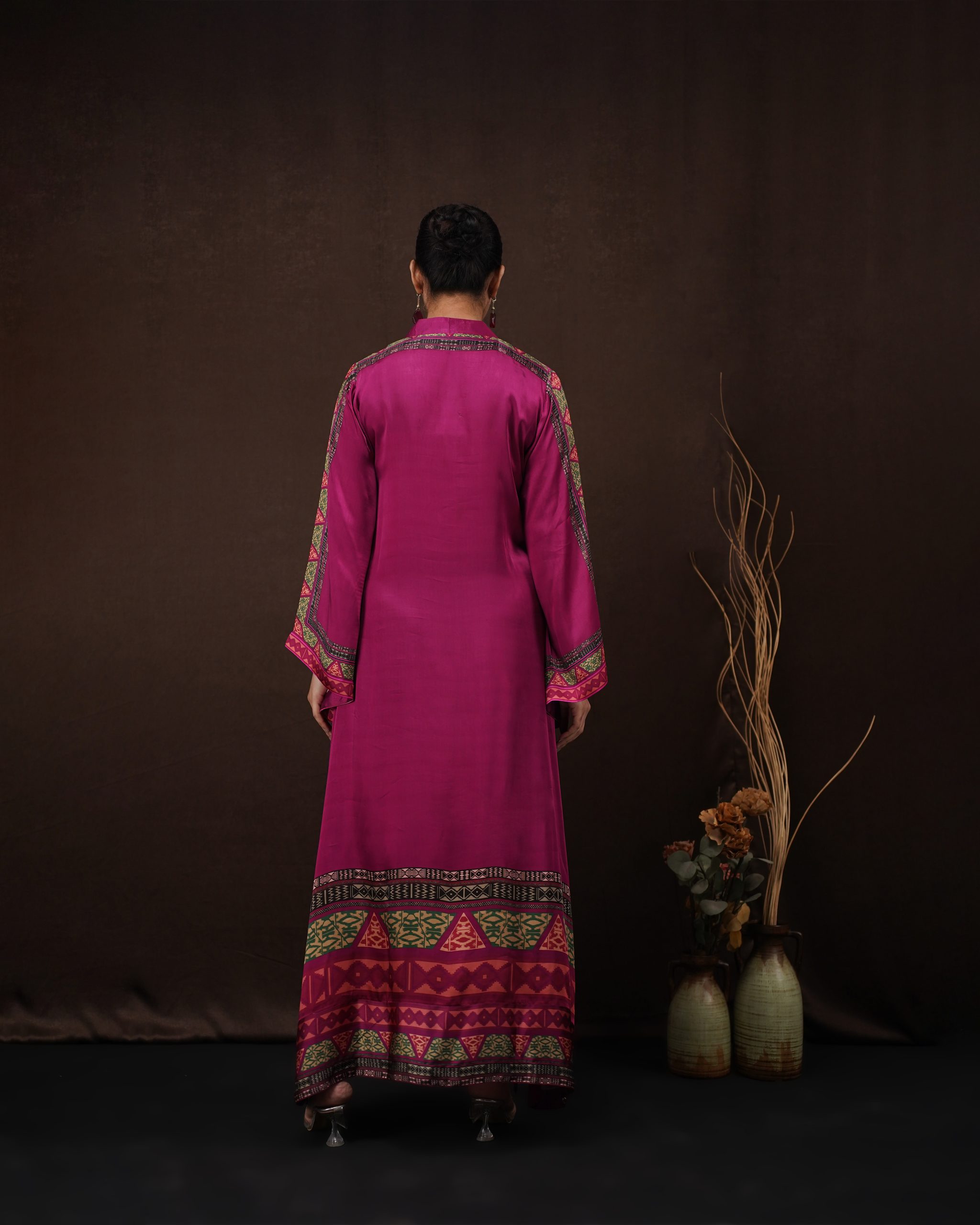 • Design: Modern kaftan silhouette featuring intricate ethnic print detailing