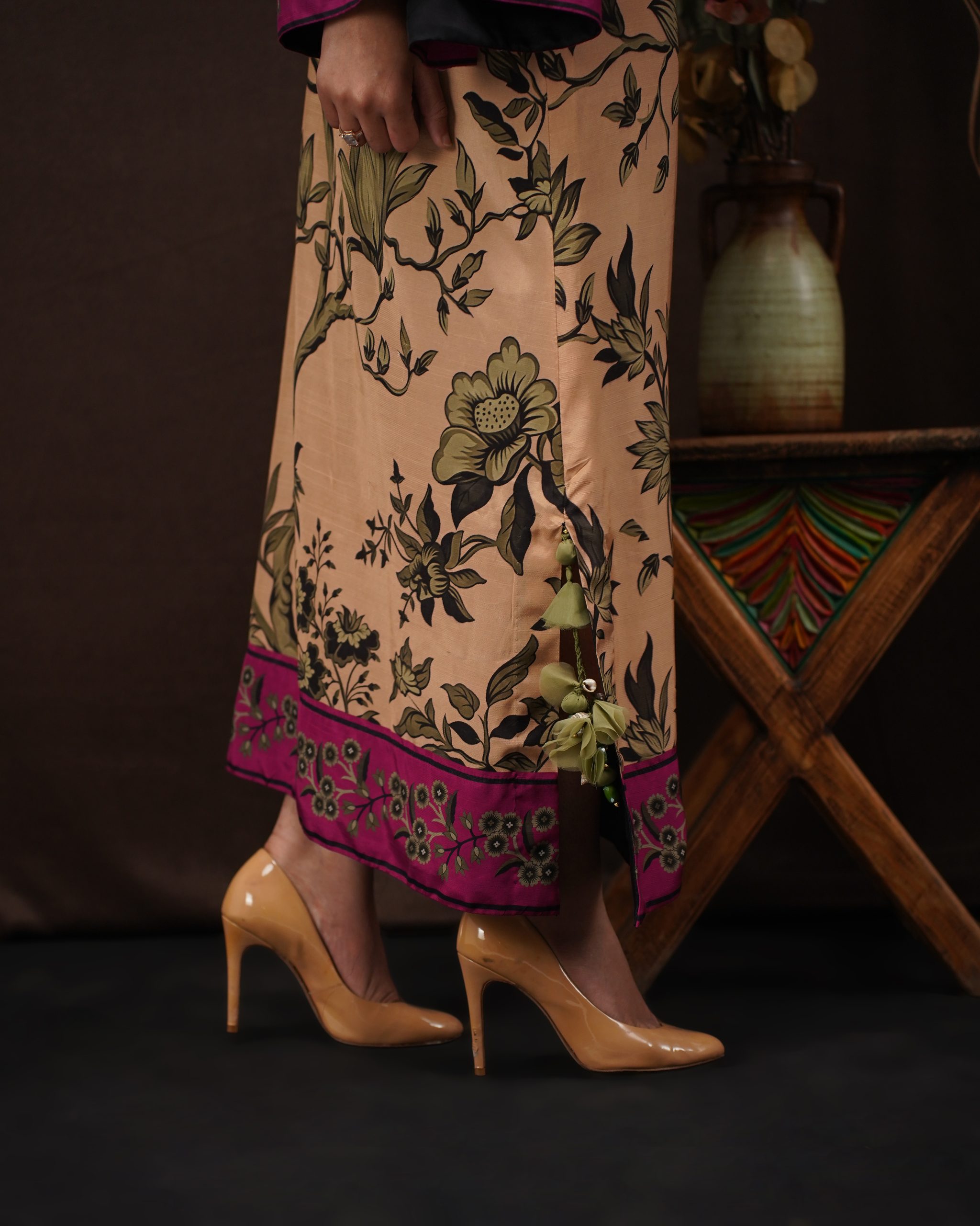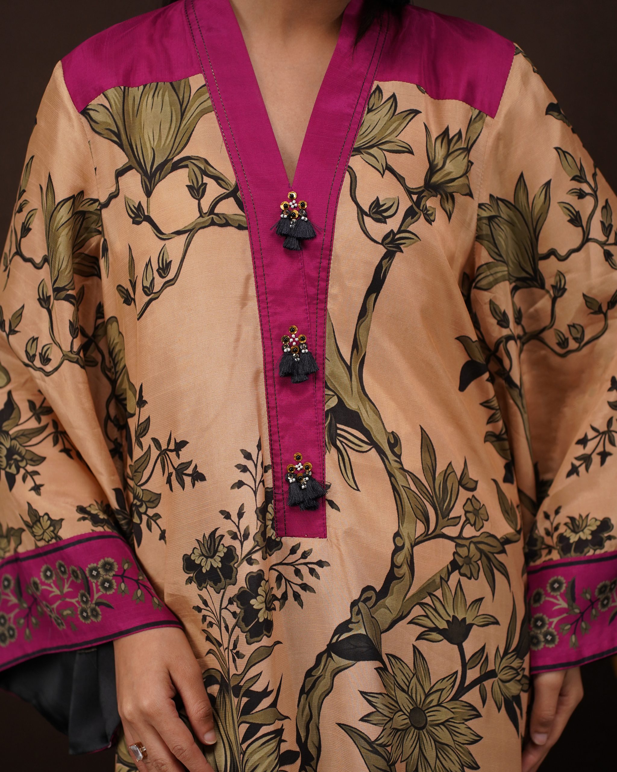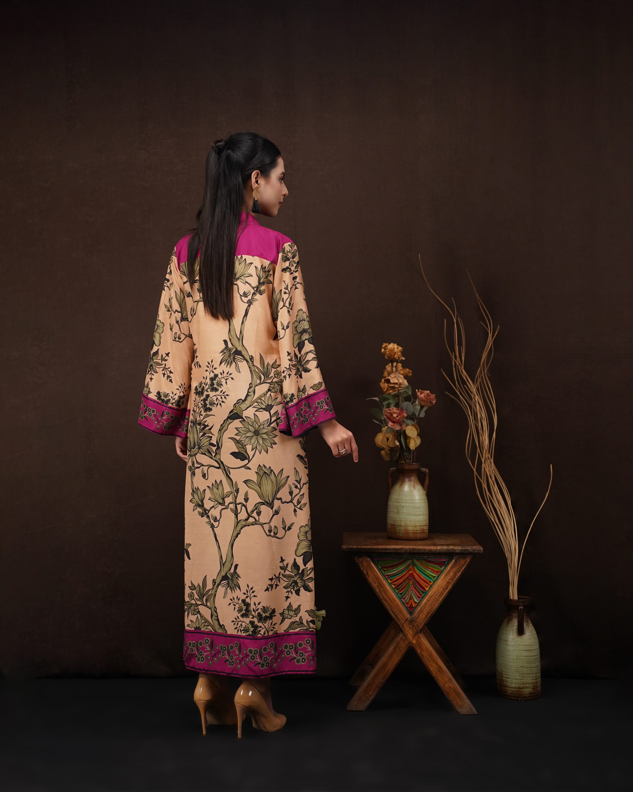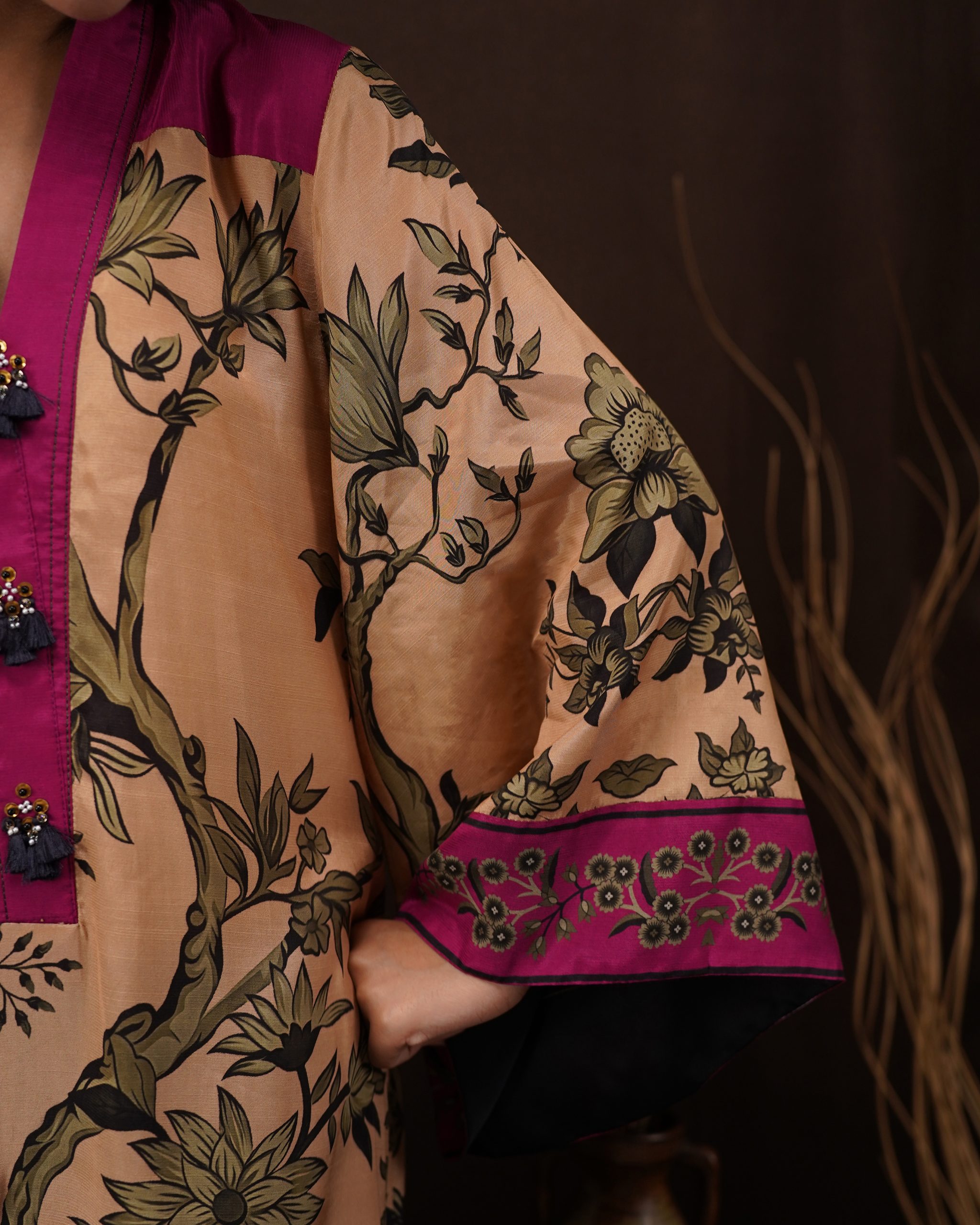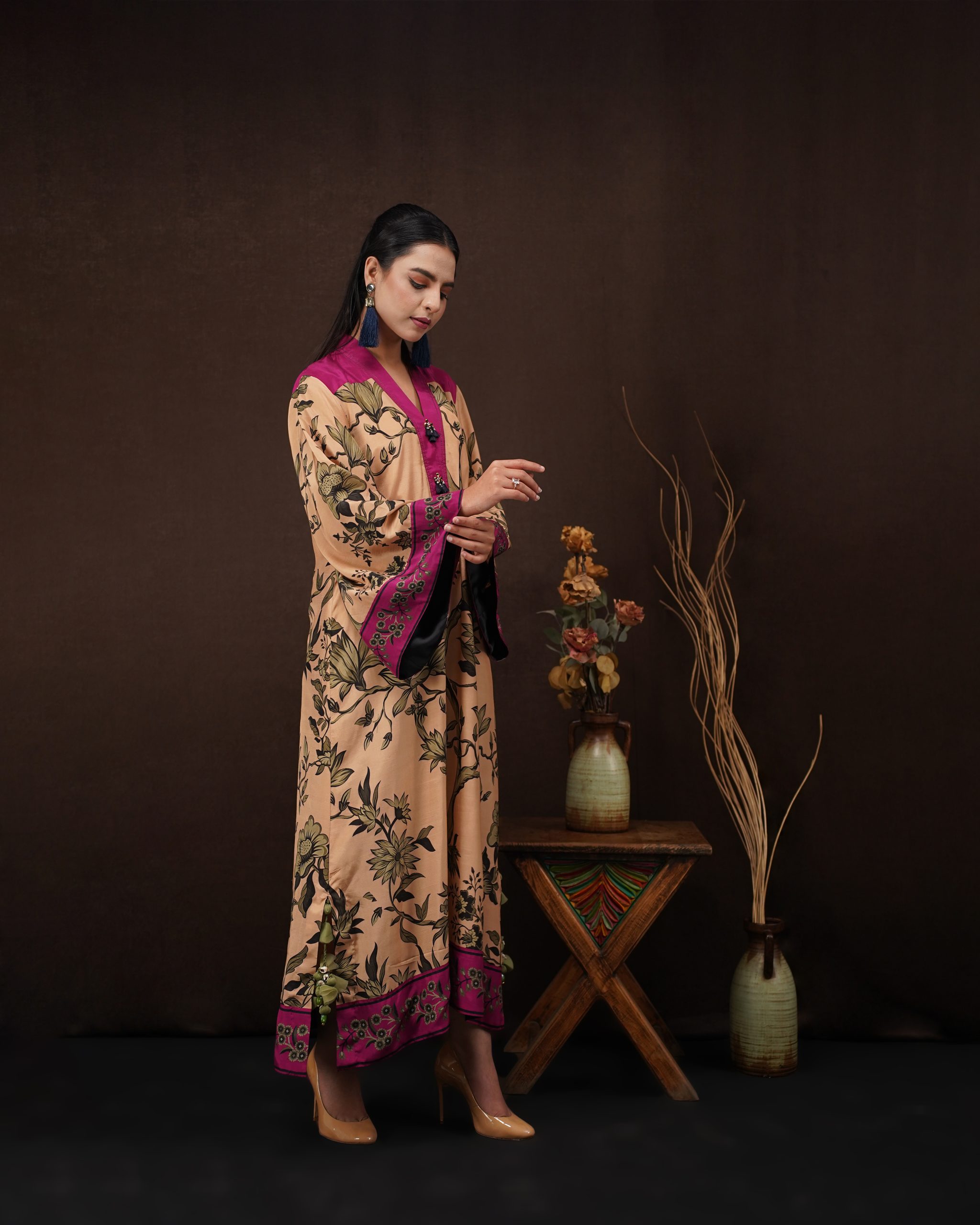 Design: Long-line flowy silhouette with artistic floral prints and contrast border detailing