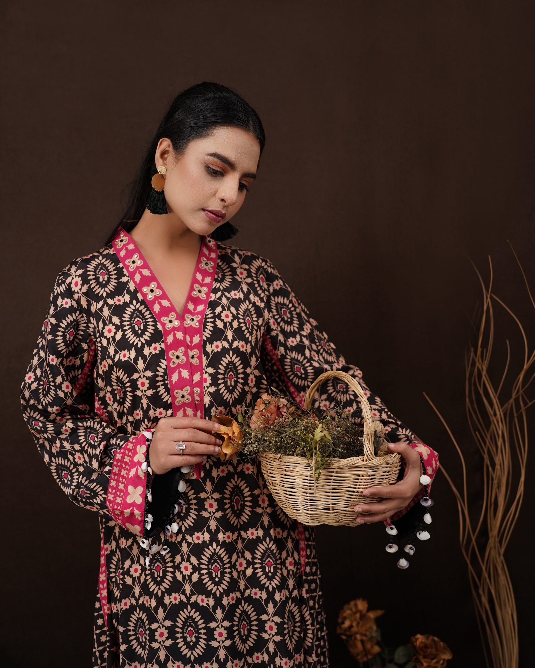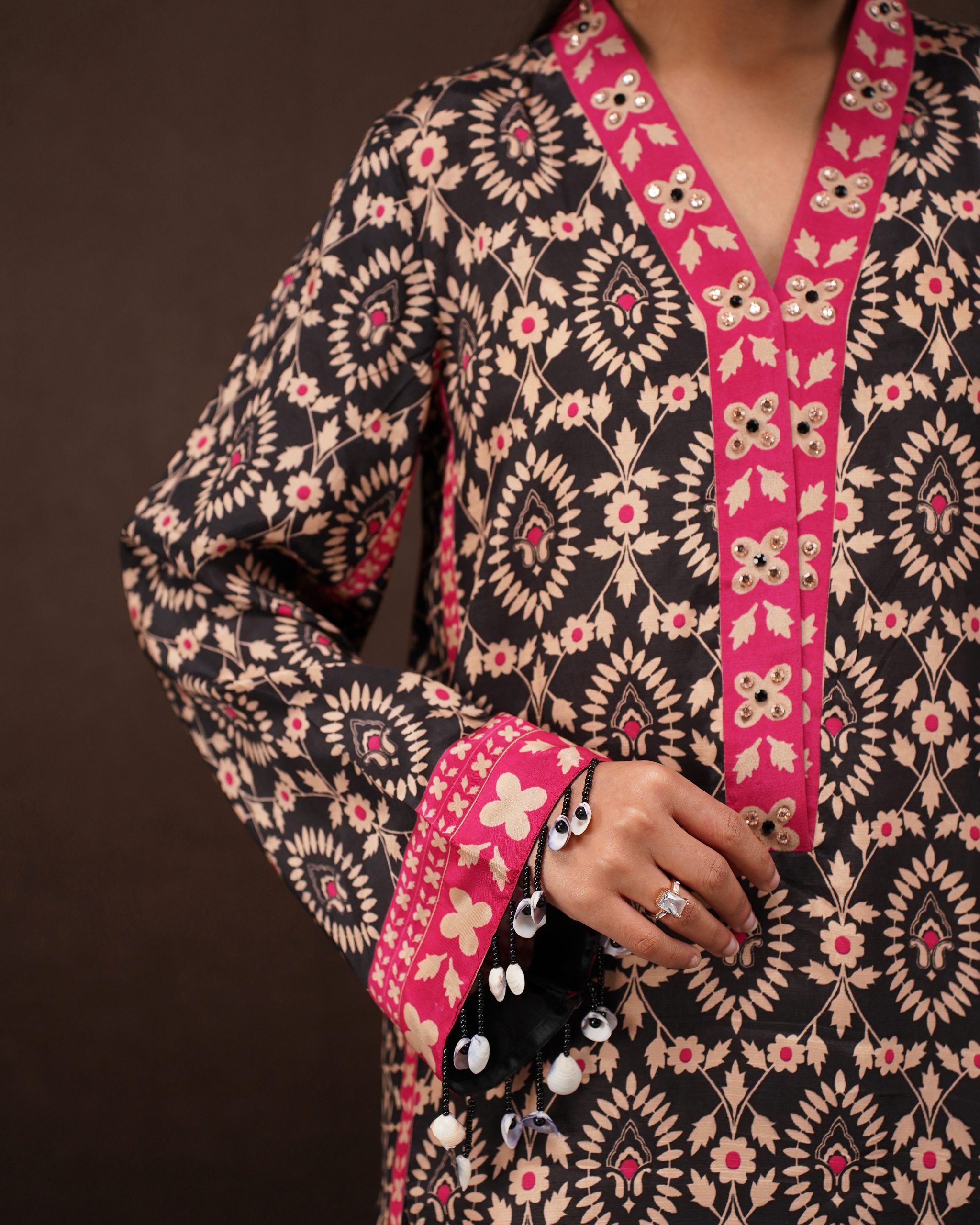 Design: Structured silhouette featuring elaborate patterns and handcrafted hanging details