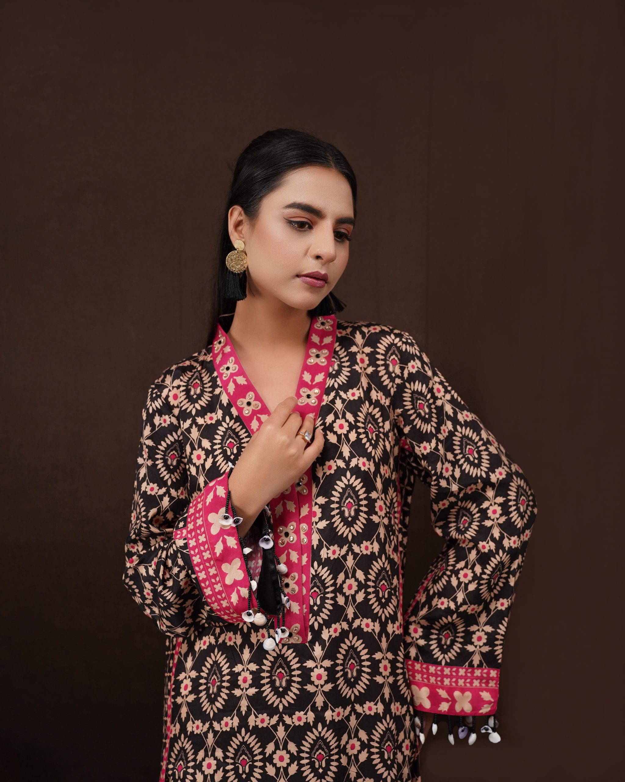 Designed for versatility, this beautiful silk kaftan dress features a relaxed silhouette that ensures comfort without compromising on style. Whether you’re attending a casual gathering or a formal event, this piece is a must-have for every wardrobe.Ideal for those searching for a kaftan dress online Pakistan, this outfit reflects contemporary fashion trends while maintaining timeless appeal. The elegant flow and unique print make it a standout kaftan women dress suitable for all body types.Among the most stylish ladies kaftan dresses, this piece is perfect for evening wear, dinners, or festive occasions. Pair it with minimal accessories for a chic, effortless look.