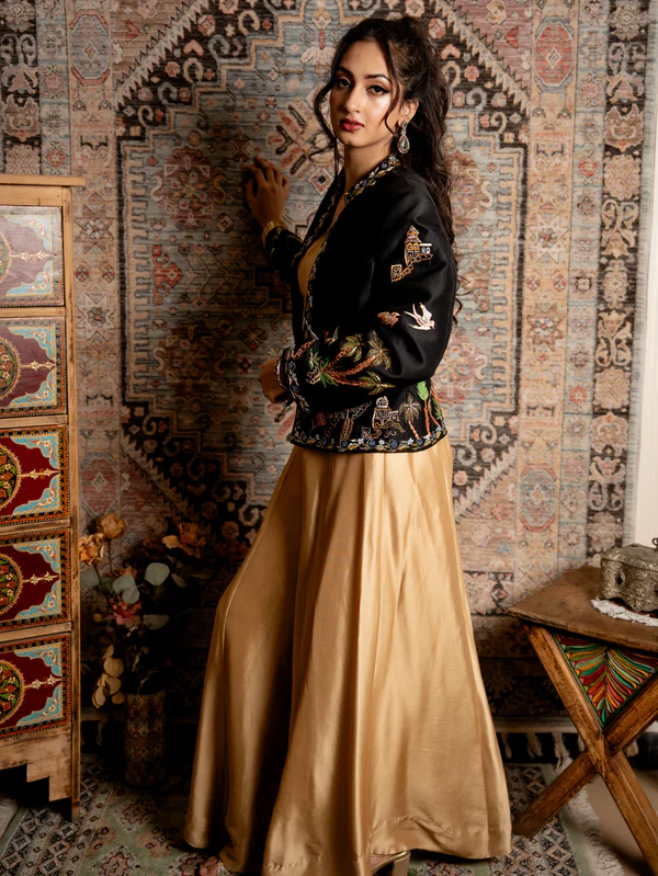 Crafted to perfection, the jacket’s rich black tone exudes power and poise, while the pure raw silk fabric adds natural luster and depth. Ideal for layering over formal ensembles or pairing with chic separates, Noir Enchant effortlessly transitions from festive evenings to refined gatherings.