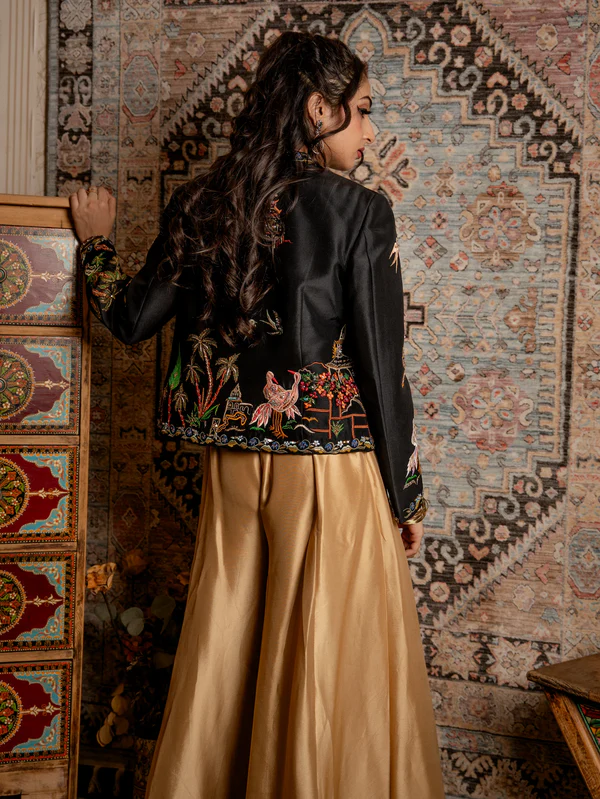 Redefine modern elegance with Noir Enchant, a short embroidered jacket exquisitely tailored from pure raw silk (80 grams). This refined design captures the essence of luxury through meticulous craftsmanship, intricate embroidery, and a perfectly structured silhouette. Every stitch reflects artistry and precision, offering a balance of sophistication and style in a contemporary length.