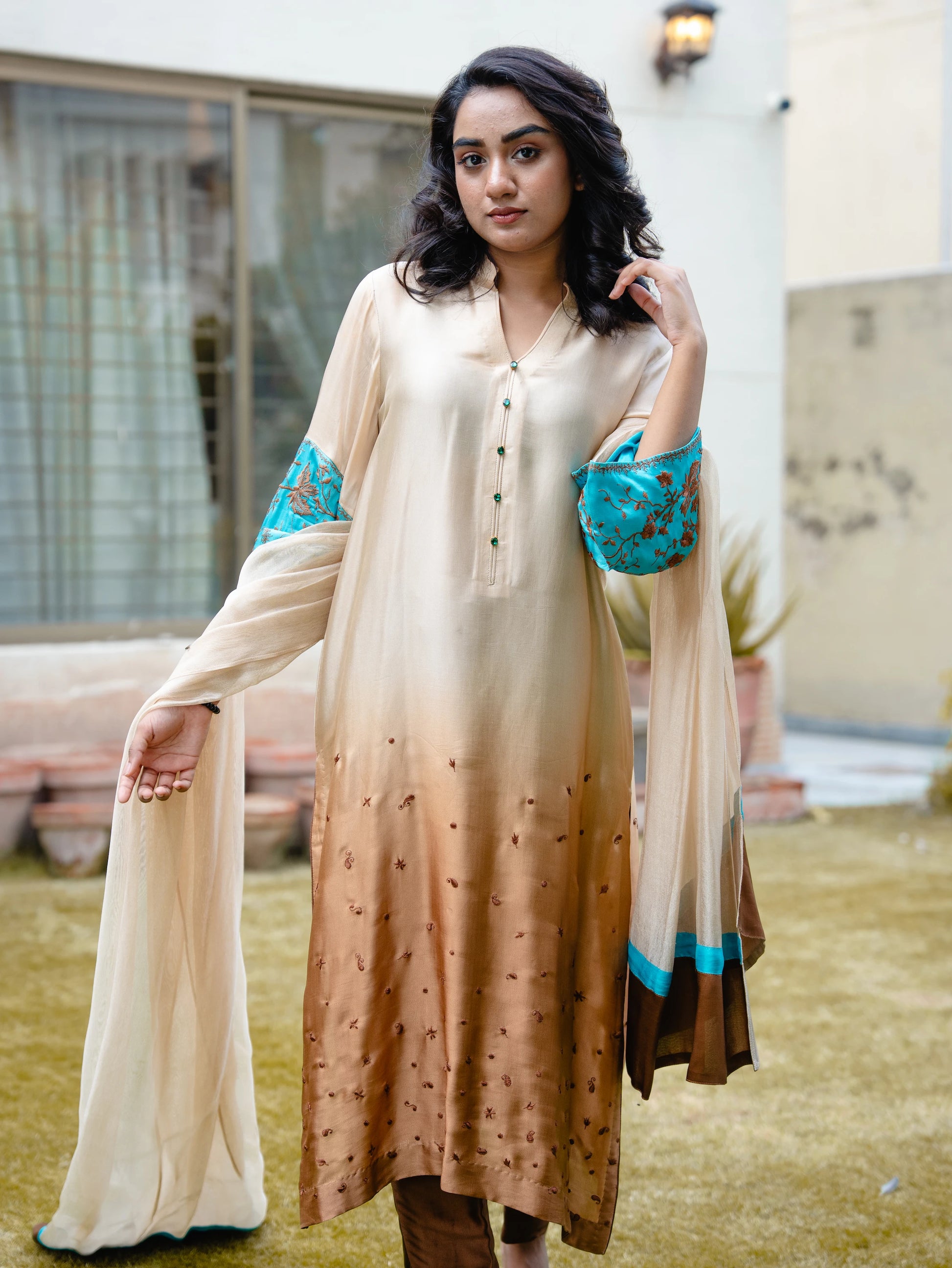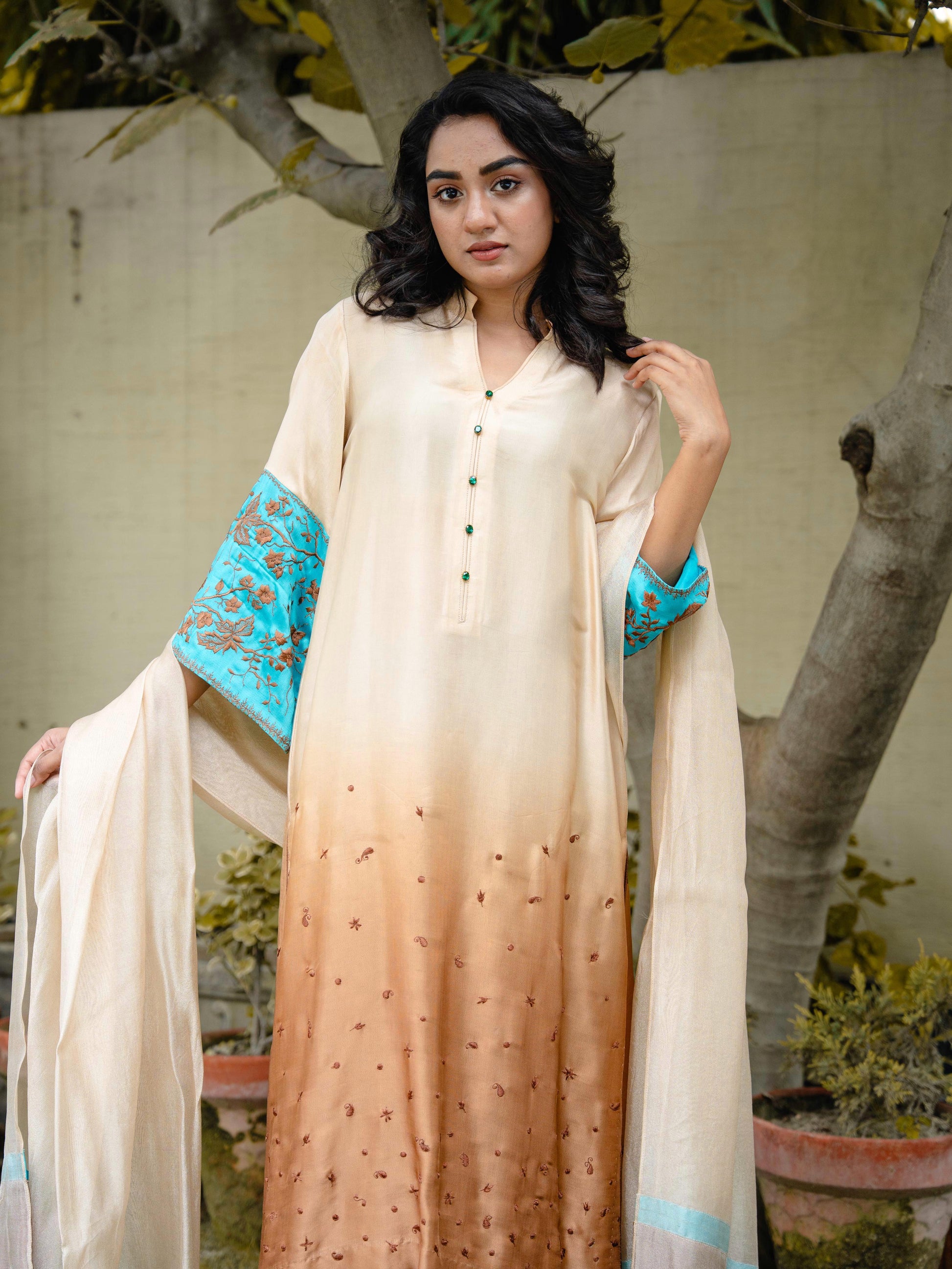 The shirt features intricate embroidery on the front and sleeves, paired with a button-detailed neckline for subtle elegance. Completed with trousers and a dupatta, the fluid drape and graceful silhouette make it the perfect statement for festive occasions and sophisticated evenings.