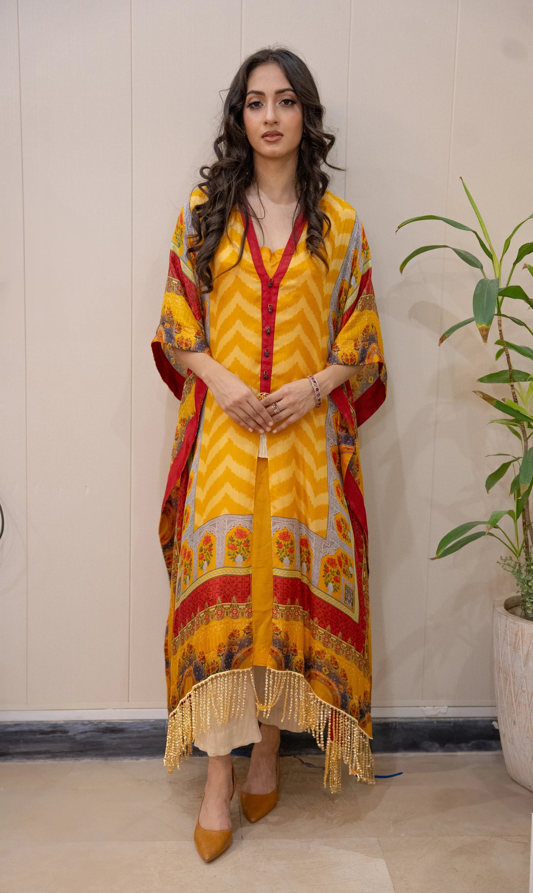 Radiate elegance with Auric Dawn, a luminous mustard yellow kaftan crafted from luxurious pure silk, paired with a soft under shirt for added comfort and grace. Designed with a modern silhouette and adorned with delicate handcrafted bead hangings along the borders, this kaftan blends vibrance with refined sophistication.