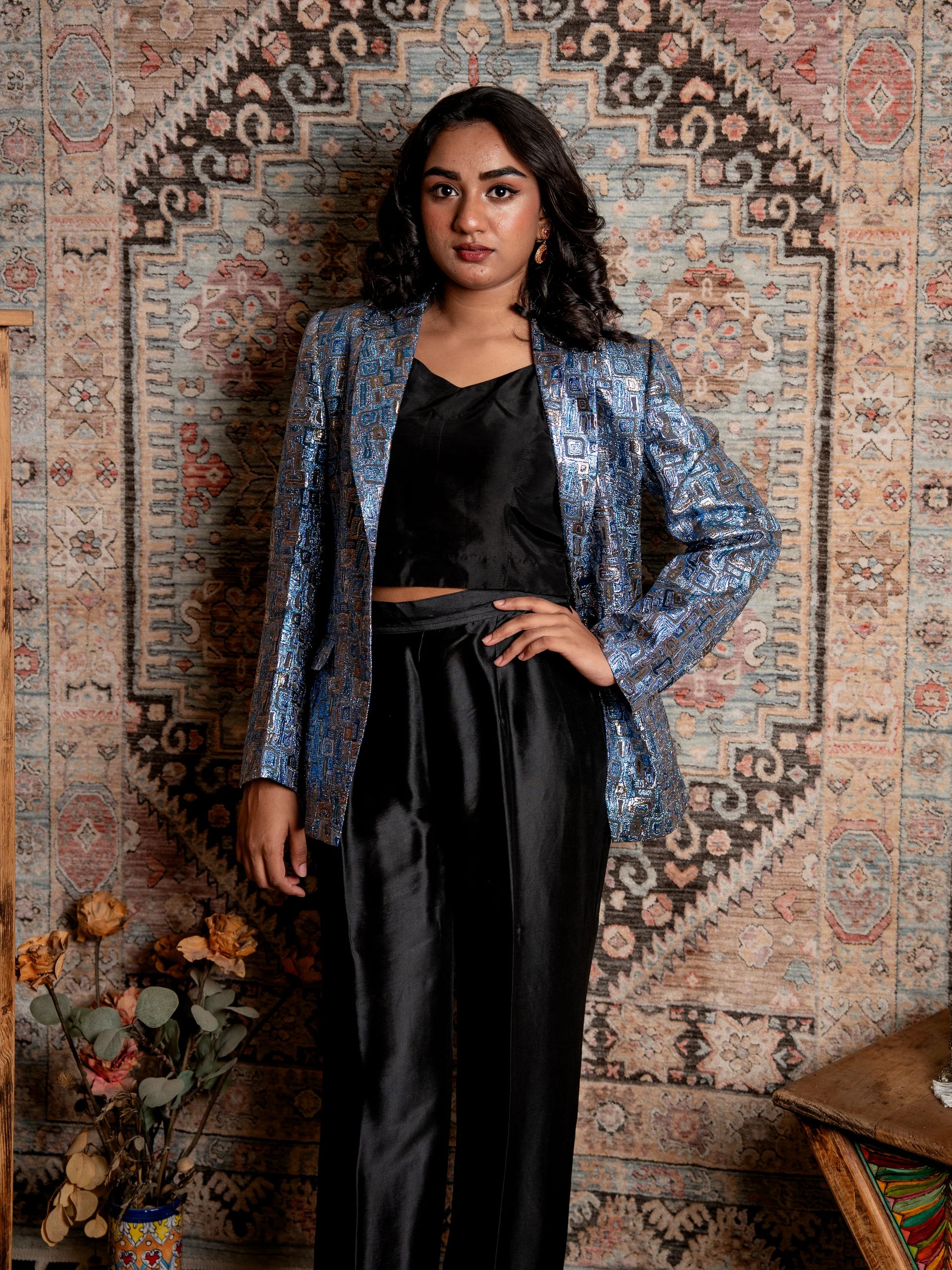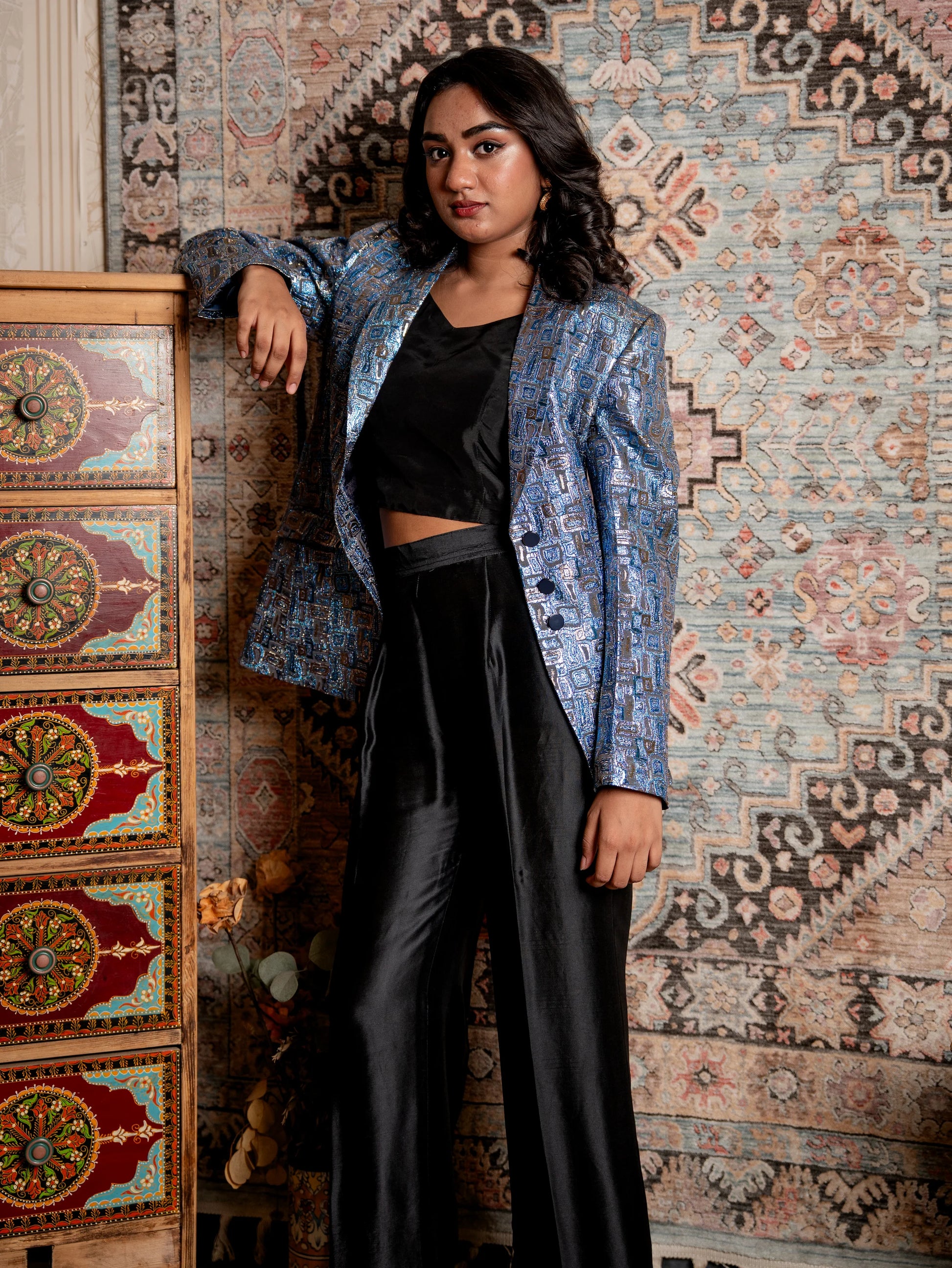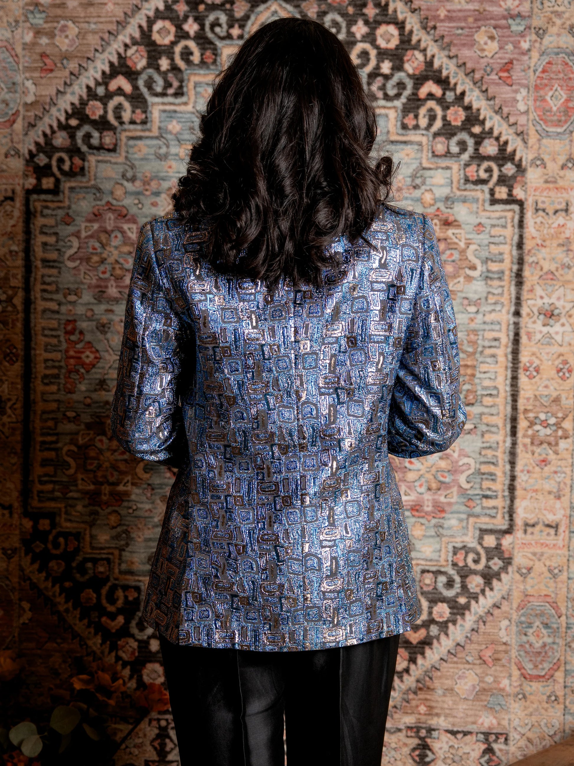 Elegant and sophisticated, Celestial Poise is a blue and silver brocade jacket designed in a timeless coat style. With its subtle sheen, refined texture, and perfectly structured silhouette, it embodies modern grace with a classic charm.