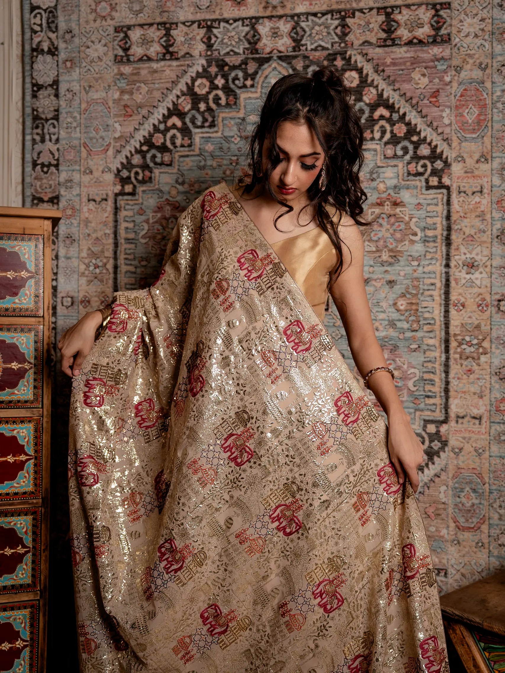 Draped in luxury, Gilded Radiance is a pure georget chiffon chaddar in a luminous gold hue. Fully crafted with intricate panni work and delicate resham embroidery, this timeless piece embodies regal elegance and fine artistry.