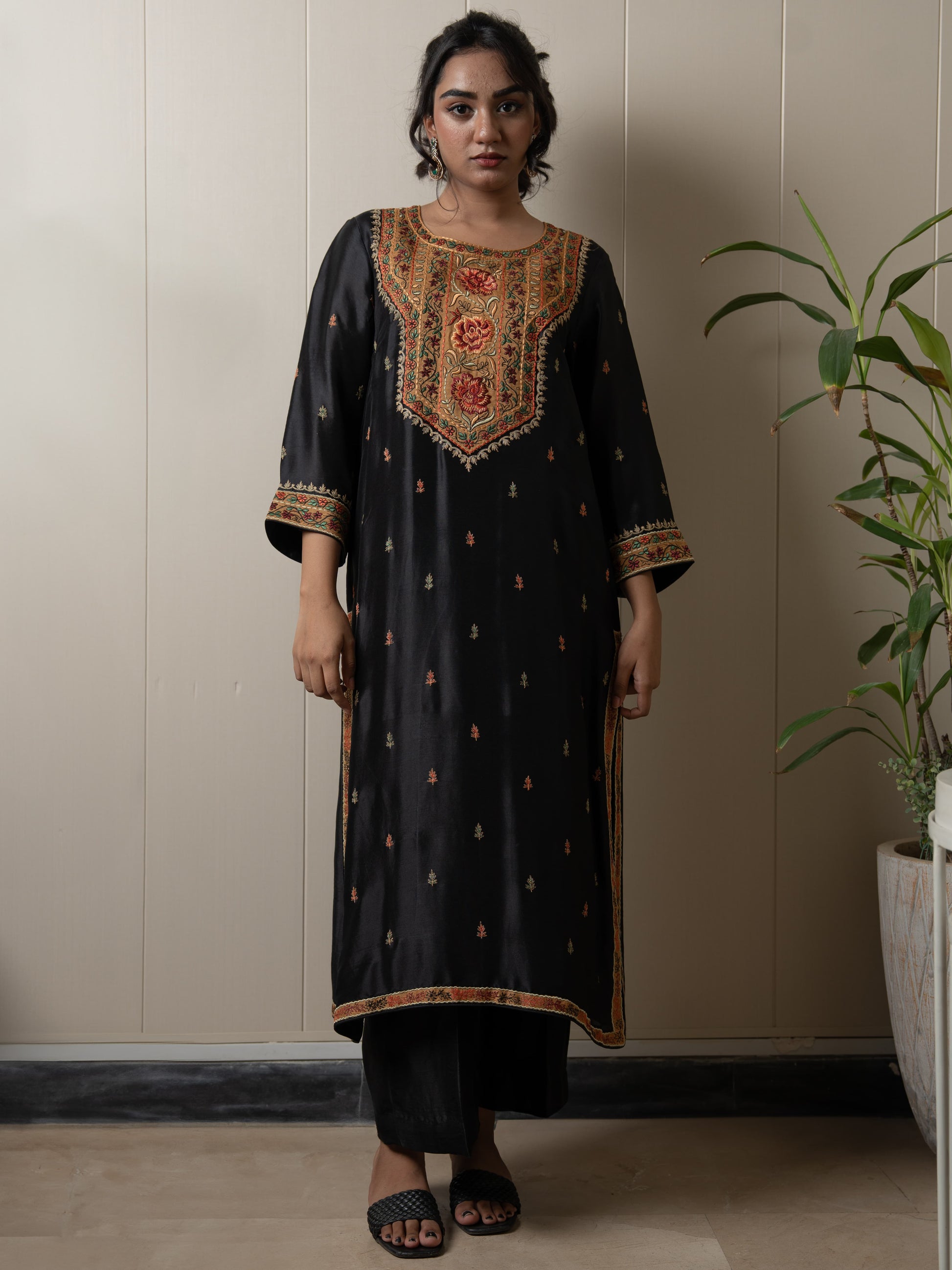 Elevate your wardrobe with Midnight Reverie — a black Kashmiri-inspired silk ensemble that redefines modern sophistication.