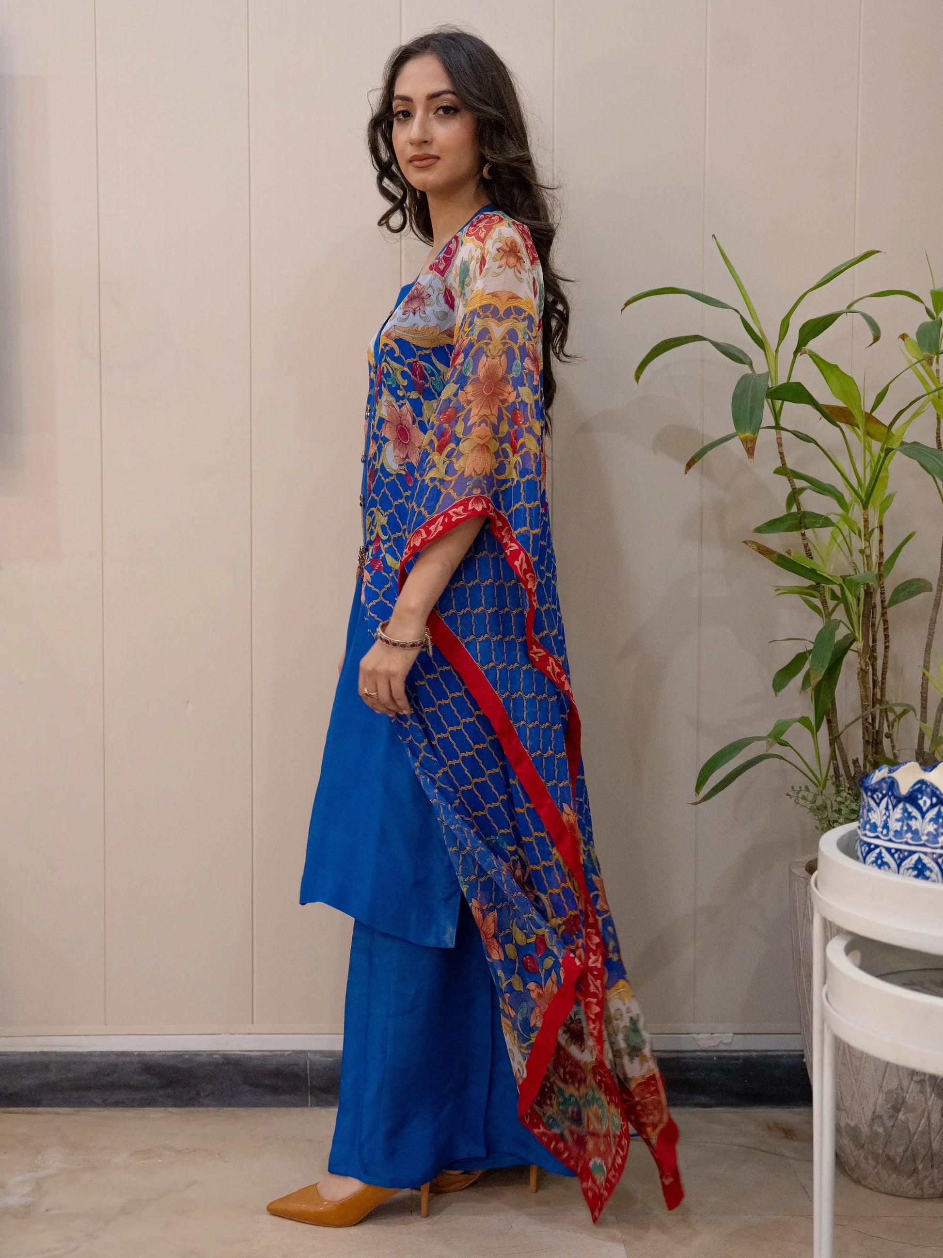 Step into effortless elegance with Midnight Sapphire, a flowing deep sapphire blue kaftan crafted from luxurious pure chiffon, paired with a soft under shirt for added comfort and grace. Designed with contemporary cuts and elevated with premium embellishments, this piece blends modern sophistication with timeless charm.