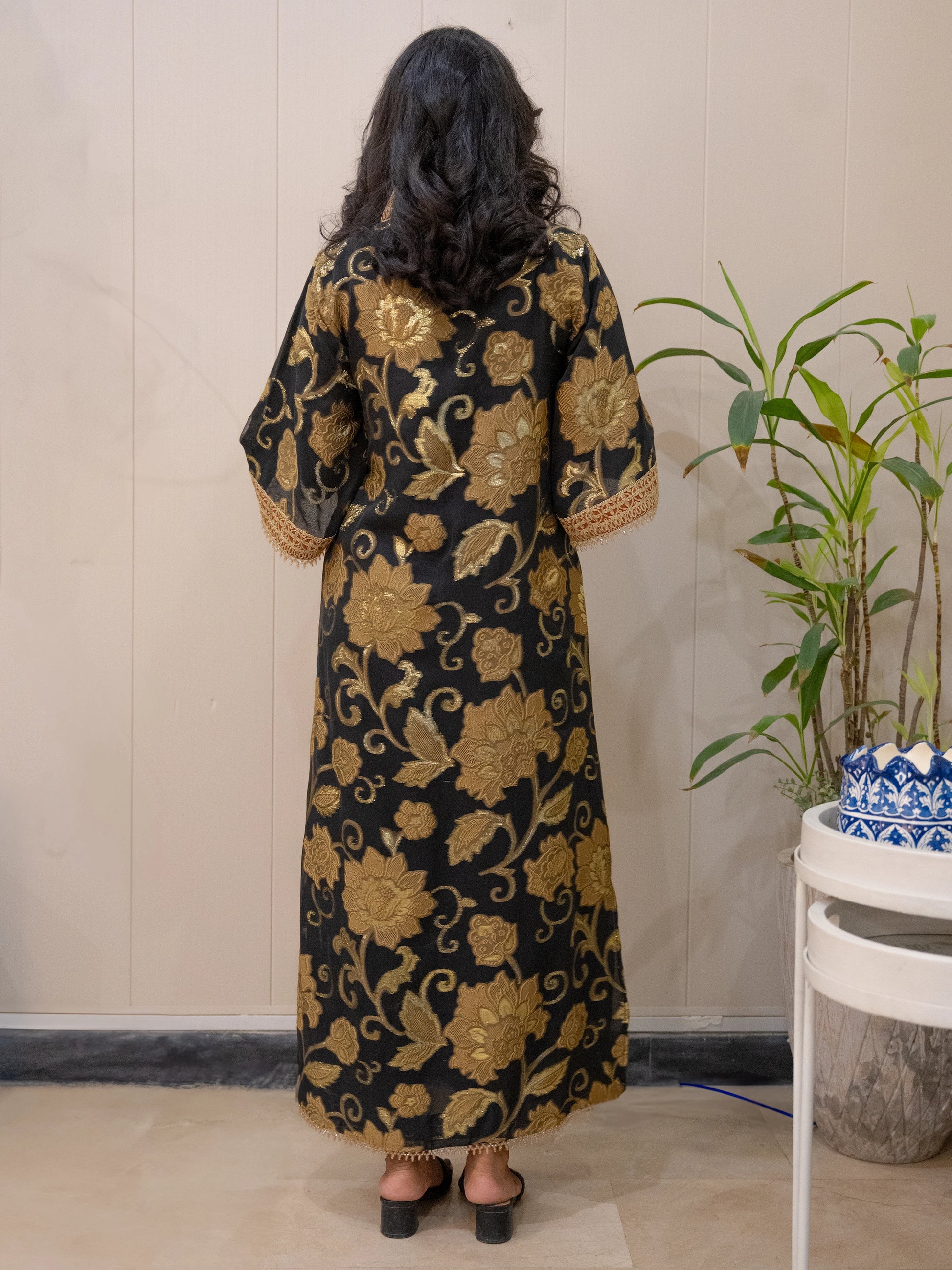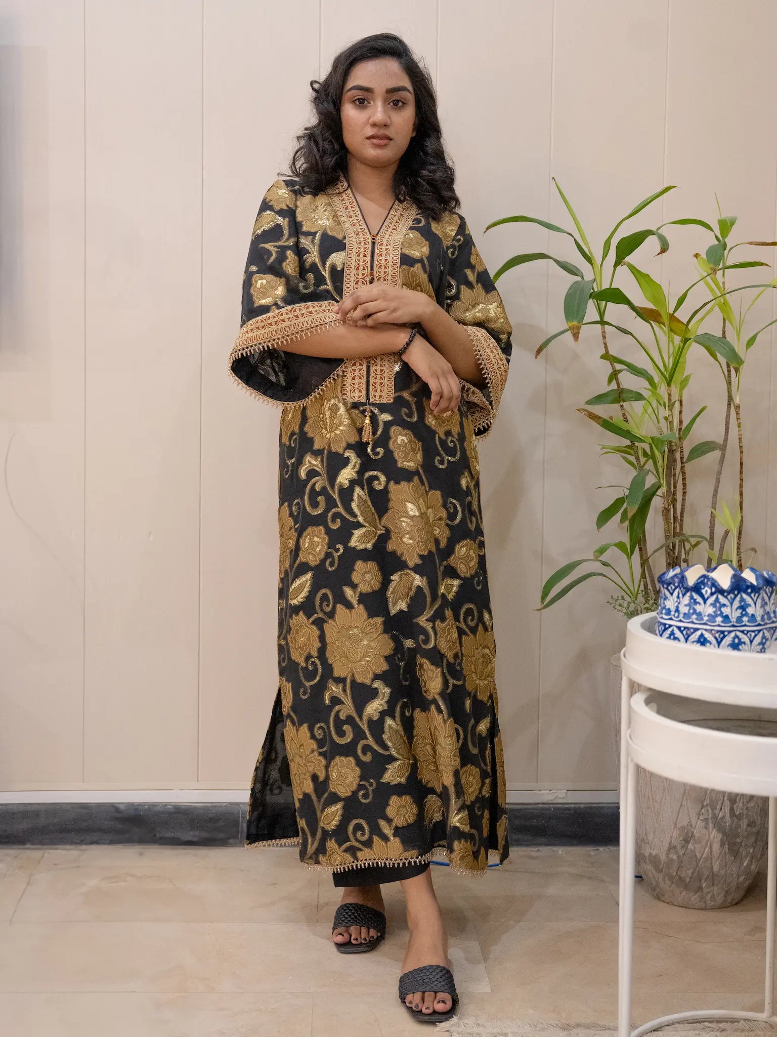 Unveil a touch of mystery with Mystic Night, an elegant handcrafted kaftan with lining that captures both grace and charm. Designed with artisanal precision, this piece features handcrafted border work and delicate bead hangings that bring movement, sparkle, and sophistication.