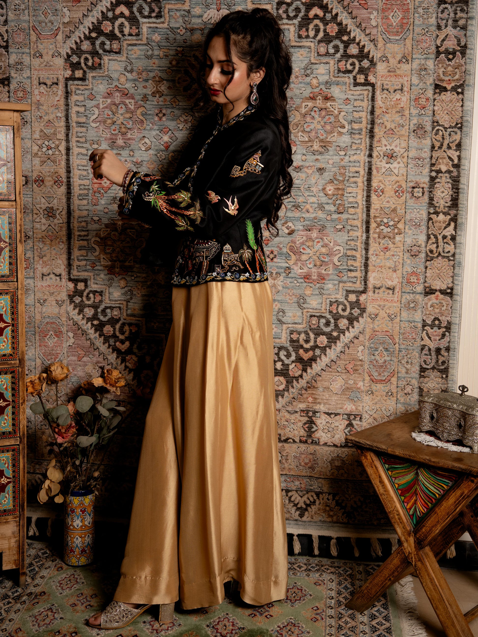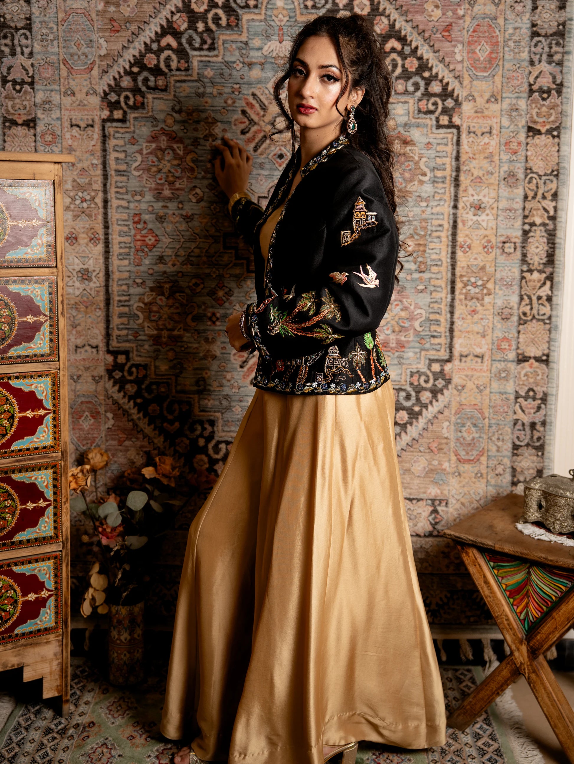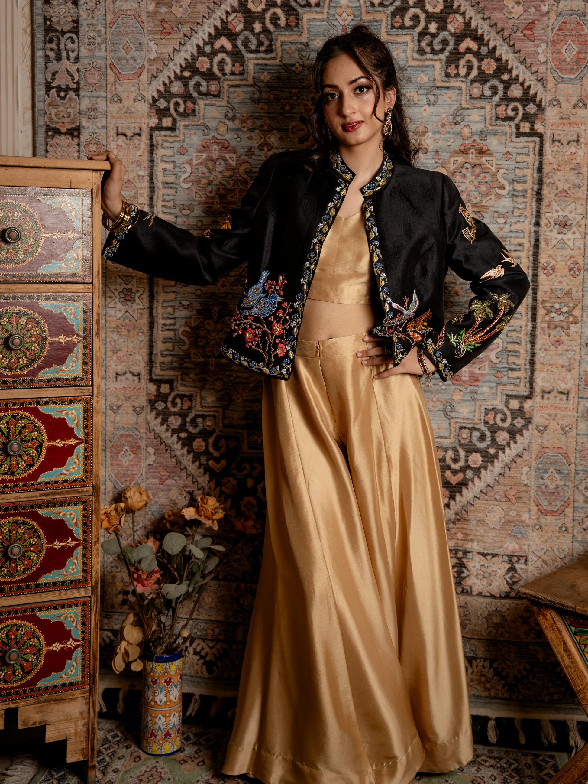 Redefine modern elegance with Noir Enchant, a short embroidered jacket exquisitely tailored from pure raw silk (80 grams). This refined design captures the essence of luxury through meticulous craftsmanship, intricate embroidery, and a perfectly structured silhouette. Every stitch reflects artistry and precision, offering a balance of sophistication and style in a contemporary length.