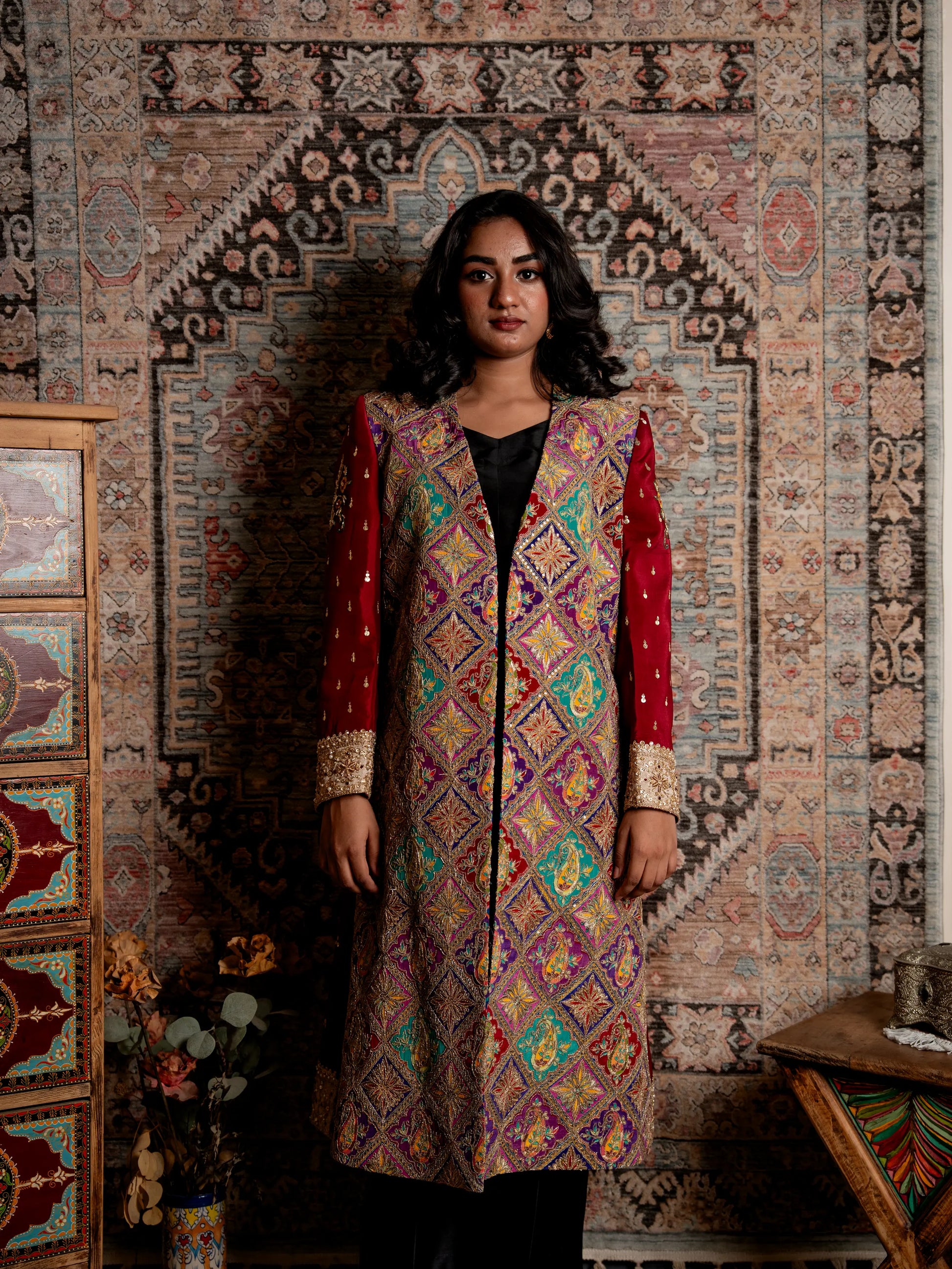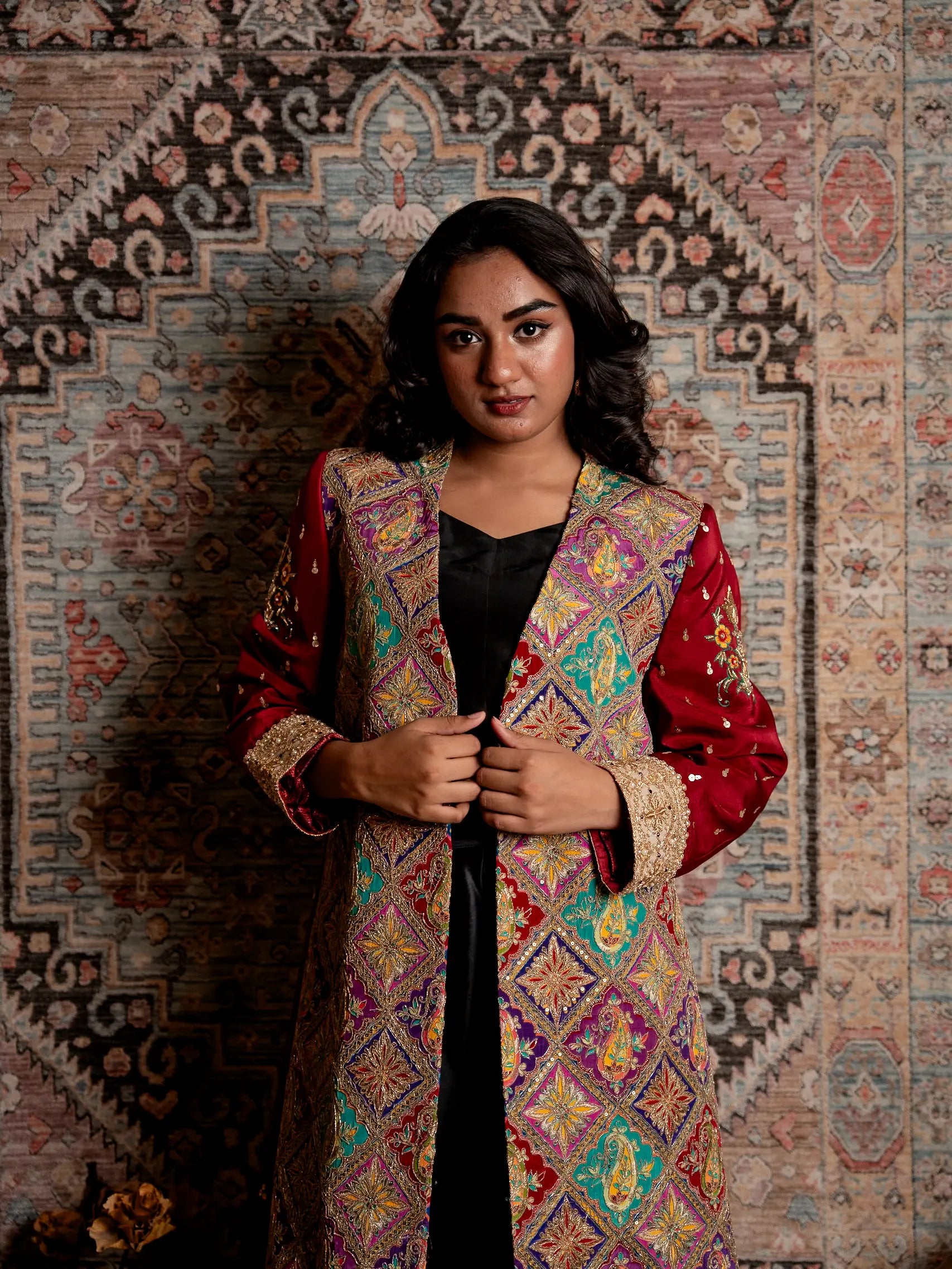 Vibrant and artistic, Radiant Muse is a multicolored pure grip jacket fully adorned with intricate embroidery. The back features exquisite embellishments that add depth and character, making it a perfect fusion of color, craftsmanship, and contemporary charm.