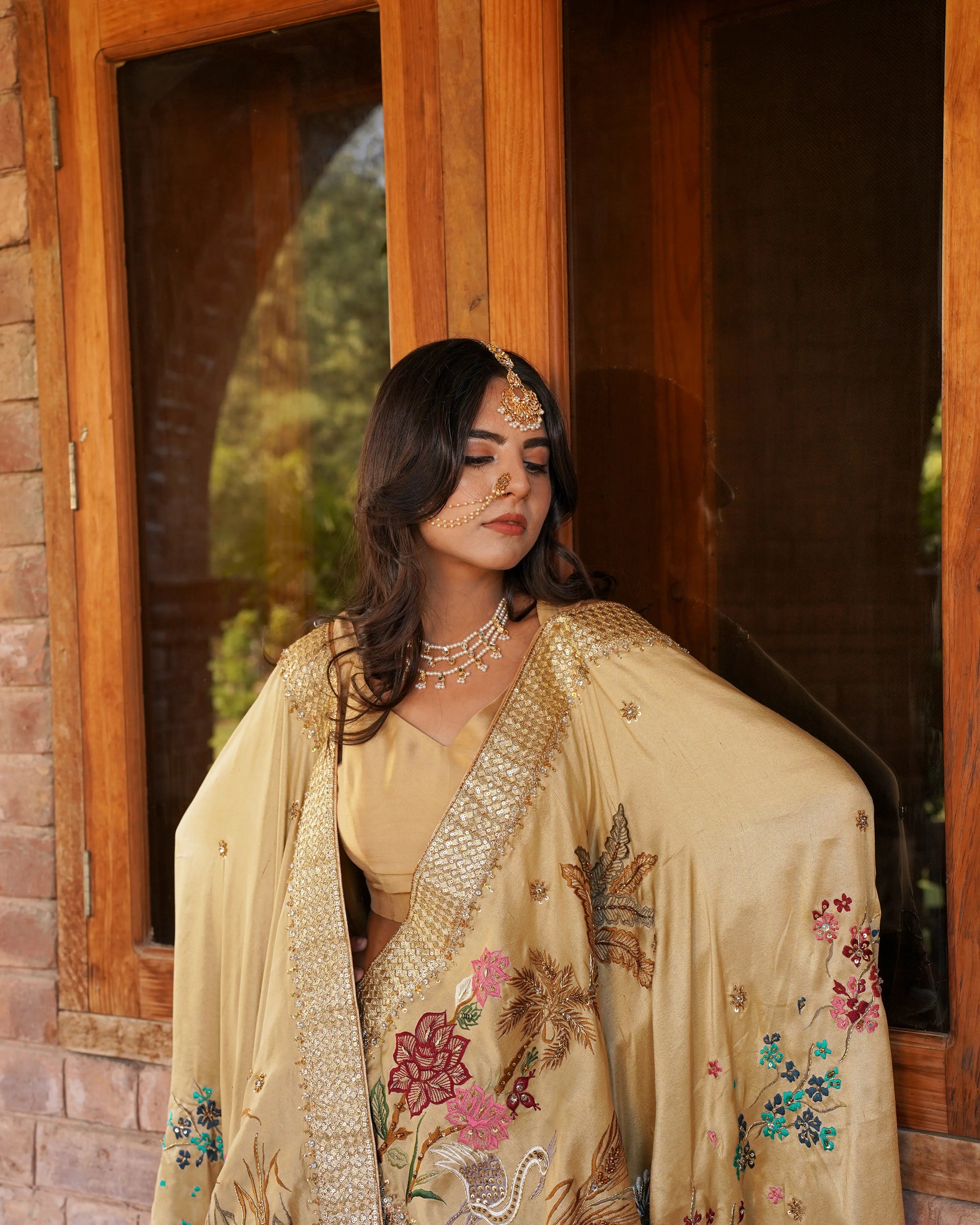 Grace meets heritage in Rang-e-Khaas , a hand embroidered pure raw silk shawl in a rich golden hue from the Dastaan-e-Reet collection. Featuring beautifully themed embroidery with delicate embellishments and finished with a chiffon jamawar lining, it drapes effortlessly, making it a timeless statement for festive and formal occasions.